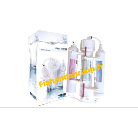 L'osmoseur KBO50 190 litres comprend trois sections. La membrane, chambre centrale, sépare de chaque côté un filtre à sédiments et un filtre à charbon actif. L'unité est par ailleurs assortie d'un régulateur de débit, ceci permettant l'équilibre entre la quantité d'eau filtrée (utilisable) et la quantité d'eau concentrée en déchets et assurant ainsi les meilleures conditions d'utilisation de la membrane.